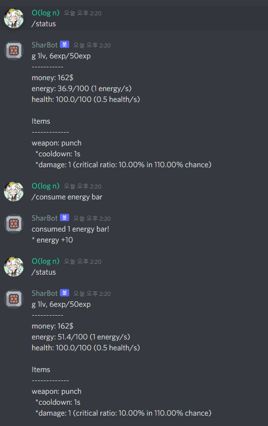 소비 시스템 역시 정상 궤도에 올랐습니다. 참고로 에너지 바라 입력해도 좋고 energy bar라 입력해도 좋습니다. 그저 두 언어권의 유저들을 동시에 얻기 위해 존재한 편의 기능이지, 무언갈 제한하기 위해 있는건 아니니깐요.