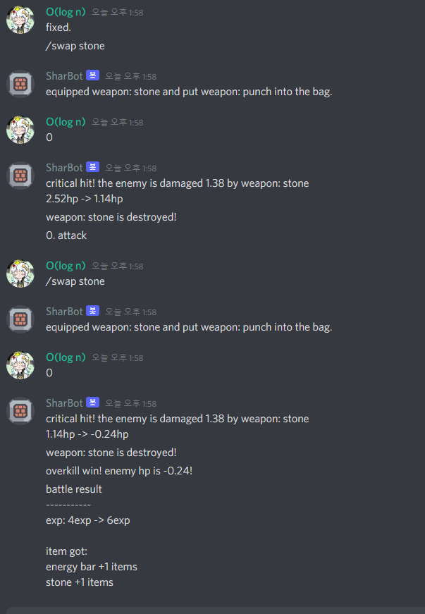 플렛폼적으로 카카오 -> 카카오 + 디스코드 전환을 병행하다 보니 일부가 아니라 정말 모든 명령어에서 문제가 생겼습니다. 고질적인 버그까지 저를 동시에 괴롭혀서 오늘 게임적 버그 대부분을 퇴치했습니다.