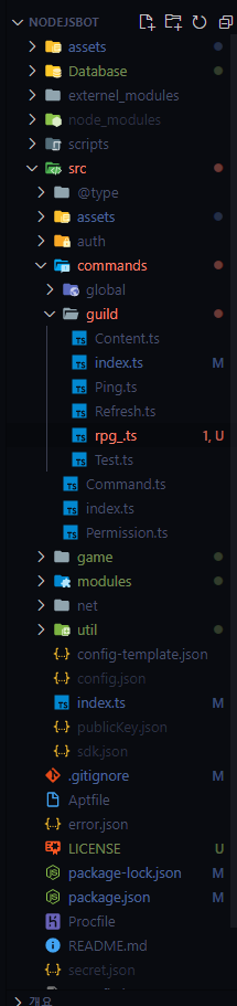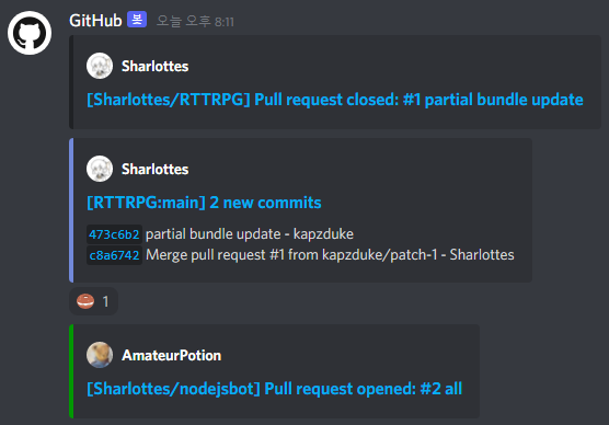 github 웹후크도 추가했습니다. 참고로 레포지토리는 카카오톡을 시작으로 둔 rpg 타입스크립트 소스고, 아래 레포지토리는 디스코드를 시작으로 둔 옛날 봇 타입스크립트 소스입니다. 전자는 제가 rpg 콘텐츠를 두루 개발하고, 후자는 같이 협업하시는 분이 구조를 짜고 계십니다.