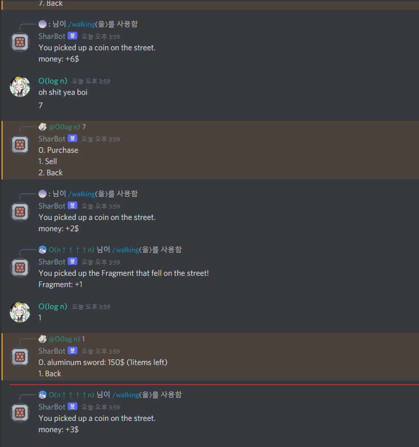 슬레쉬 명령어를 통한 함수 사용에 성공했습니다. 이전에 구조를 잘 짜둔게 정말 큰 도움이 되었습니다. 디스코드는 봇이 보낸 메시지를 스스로 수정할 수 있는 .editText 메소드가 있으니 임베드 기능과 함께 도배 방지에 집중..하기 전에 일단 모든 명령어를 포팅해야 합니다. 계정 등록이나 로그인 명령어는 DM에서 해야 하기 때문에 그부분도 만들어야죠.