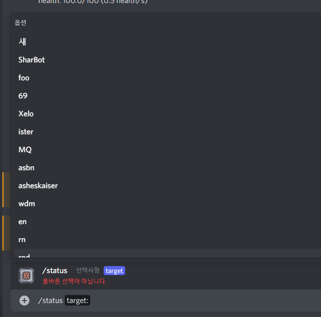 슬레쉬 명령어의 가장 큰 장점이라면 이걸 뽑을 수 있겠습니다, 바로 옵션 기능이죠. 굳이 원하는 매개변수가 아닐 경우를 생각하지 않아도 됩니다, 옵션에서 다 제시해주니깐요! 필수 인자를 생략하면 슬로우 모드처럼 화면이 흔들립니다.