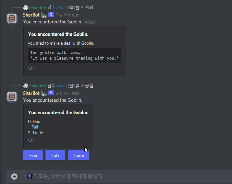 위 GIF는 고블린 거래 모습을 녹화한 것입니다. 아이템 버튼을 누른 다음 수량을 선택해서 구매하거나 판매합니다. back를 통해 나갈 수 있습니다. 아이템을 잘못 선택했을 때도 사용이 가능합니다. 코드 블록이 임베드와 컴포넌트 다음으로 게임 외관을 많이 살려줬습니다. 이전 상점 시스템과 비교하자면 엄청날 수준이죠.