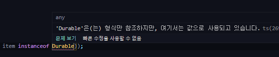 결국 getOne에 Durable 인터페이스를 상속하는 아이템 배열을 넣어야 합니다. 하지만 대체 어떻게 아이템 배열에서 Durable 인터페이스를 상속한 아이템만을 필터링할 수 있을까요? 다른 언어라면 instanceof 연산자로 인터페이스의 상속 여부를 확인할 수 있지만 그건