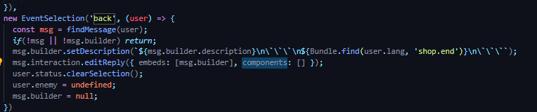 원인은 위 버그로부터 비롯됩니다. setDescription을 통해 새 메시지를 추가했지만 editReply를 통한 컴포넌트 제거는 이루어지지 않았습니다. 동기로 처리했기 때문이라고 생각해서 await async를 사용해봤지만 컴포넌트가 제거되고 다시 생성되는 기이한 버그가 대신 절 반깁니다. 이건... discord.js-pages 모듈을 사용한 문제라고 봅니다. 사실 이 모듈은 인터렉션과 임베드, 컴포넌트를 접한 계기로 작용했지만 정작 이걸 사용할 타당한 이유는 명시되지 않았습니다. 이참에 이걸 왜 사용해야 하는지 알아야겠네요.
