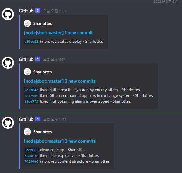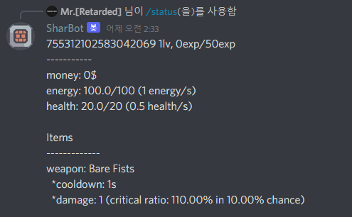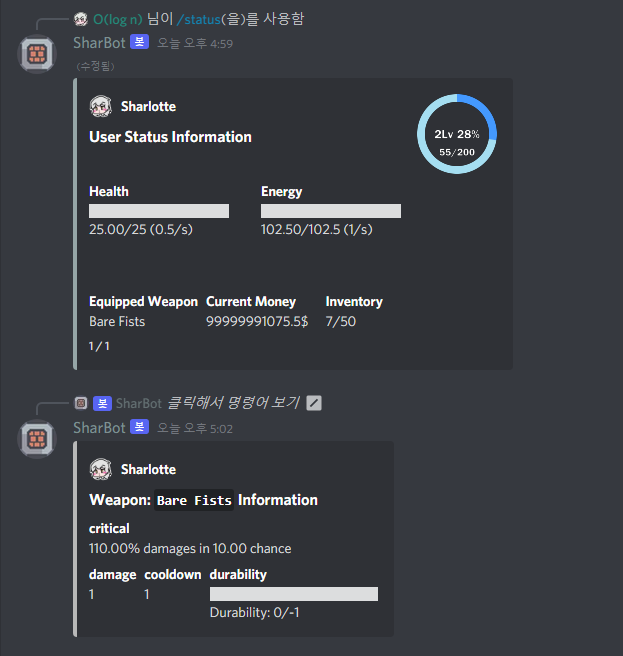 유저 상태창을 크게 개선했습니다. canvas 모듈을 통해 임베드 썸네일 자리에 경험치 바를 넣었으며, 유니코드 바를 통해 일부 스탯을 표현했습니다. 이후에도 표시할 정보가 늘어날 때마다 개선을 거듭할 생각입니다.