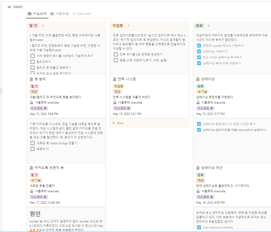 TODO 노션에서 개발 예정인 것과 개발 중인 것, 개발 완료된 것들을 볼 수 있습니다. 이 TODO 노션의 핵심 목적은 최소한 머릿속의 "아 할 거 없다"가 안 나오게 만들기 위함입니다.