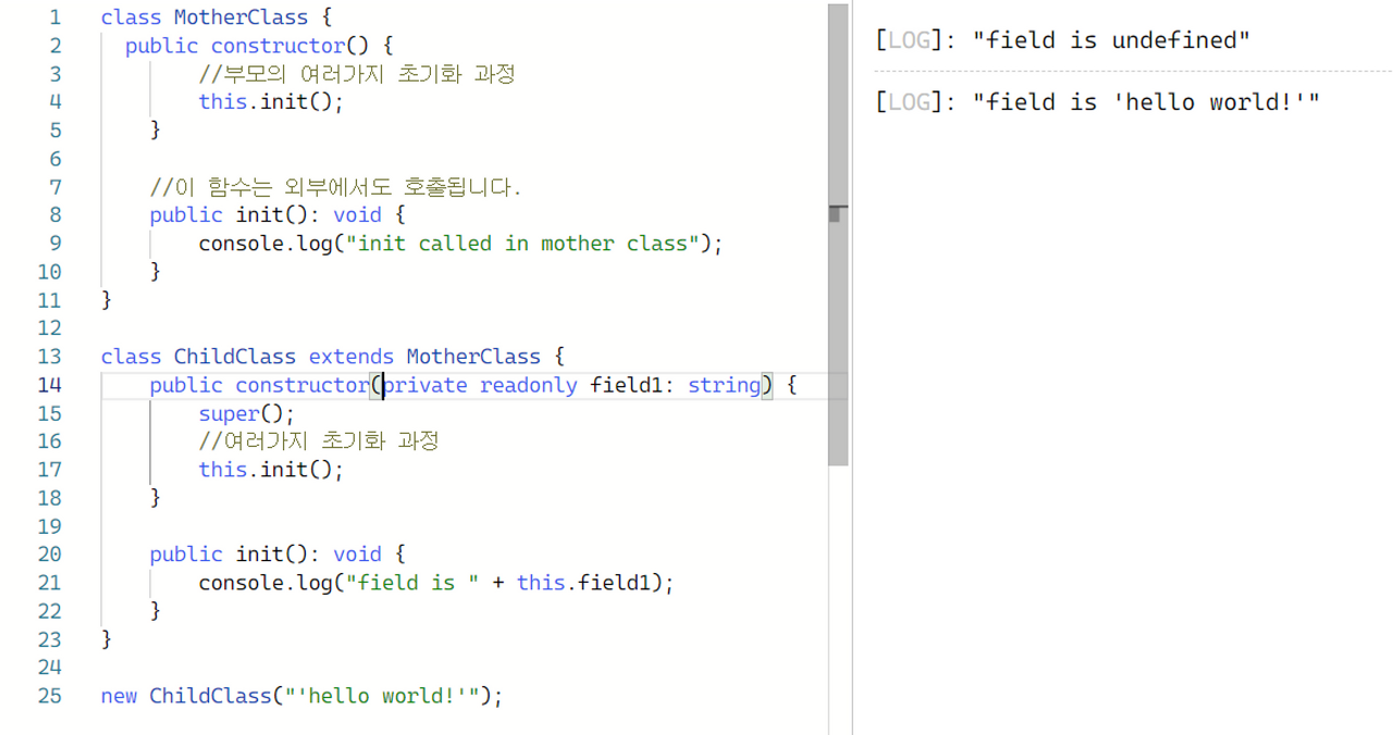 파라미터 프로퍼티는 위치상 생성자 함수의 가장 윗부분에 있기에 가장 먼저 초기화되어 super() 안에서도 초기화된 field1을 사용할 것 같지만, 실제로 테스트해보면 그렇지 않음을 알 수 있습니다.